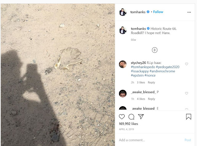 Por anos, Tom Hanks tem assustado as pessoas com fotos bizarras de luvas individuais, sapatos ou botas encontradas no chão, combinadas com legendas estranhas. Muitos dos comentários sobre essas imagens afirmam que essas imagens realmente representam pessoas que foram mortas ou sequestradas pela elite ocultista.Cerca de um mês antes da morte de Kappy, Hanks (que foi acusado por Kappy de pedofilia) postou a foto acima de uma luva na Rota 66 (Kappy morreu na Rota 66) com a legenda:'Rota Histórica 66. Estrada da morte? Espero que não! Hanx'