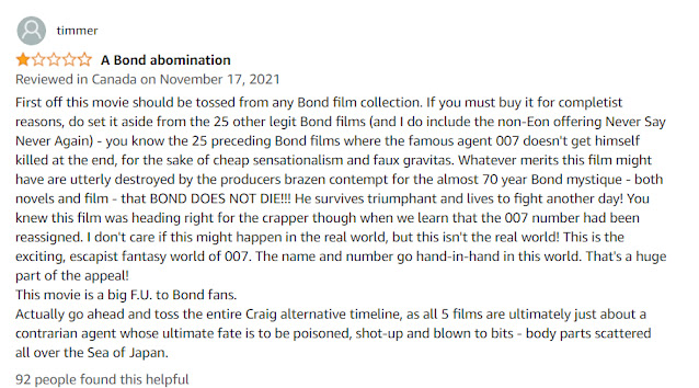 Então, quando o filme (finalmente) acabou, meu rosto estava enrugado em total confusão. Não posso dizer que sou um aficionado de James Bond, mas esse filme não parecia James Bond. Ele não é tudo sobre armas, garotas e gadgets? Com o rosto ainda franzido, procurei algumas críticas de filmes para ter certeza de que não estava louco. Esta foi a melhor crítica da Amazon.